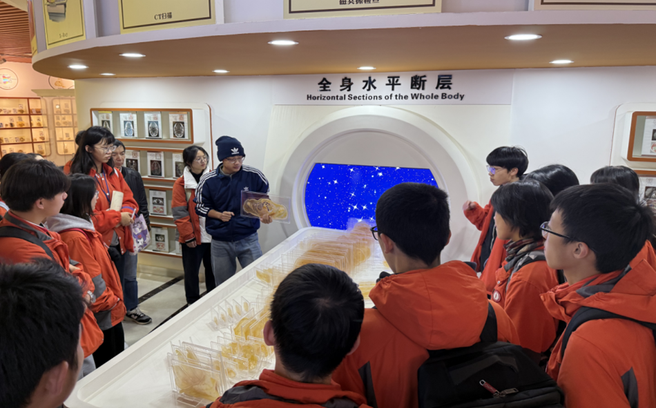 随后,研学活动进入了同学们最感兴趣的环节——参观人体科学馆。通过生动视频与珍贵标本相结合的创新形式,同学们系统了解了胚胎发育的神奇过程与人体九大系统的精妙构造。从健康到疾病的直观对比,不仅加深了他们对人体知识的理解,更在他们心中播下了尊重生命、热爱医学的种子。