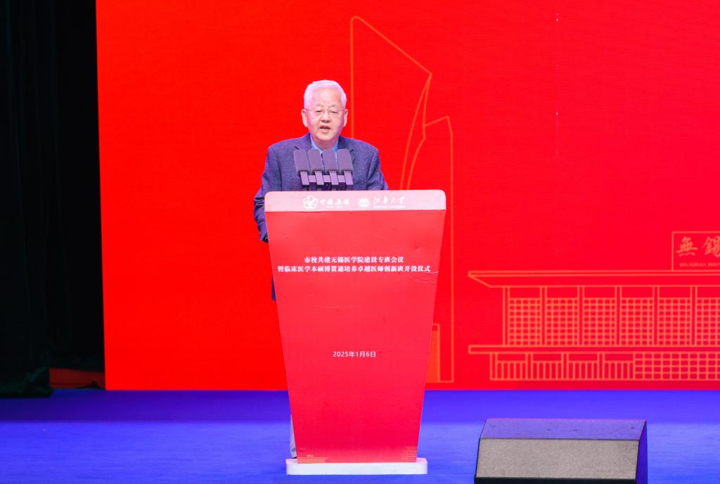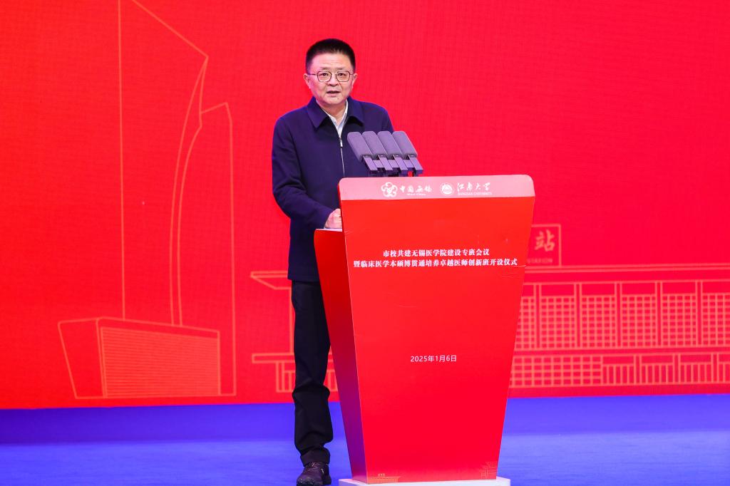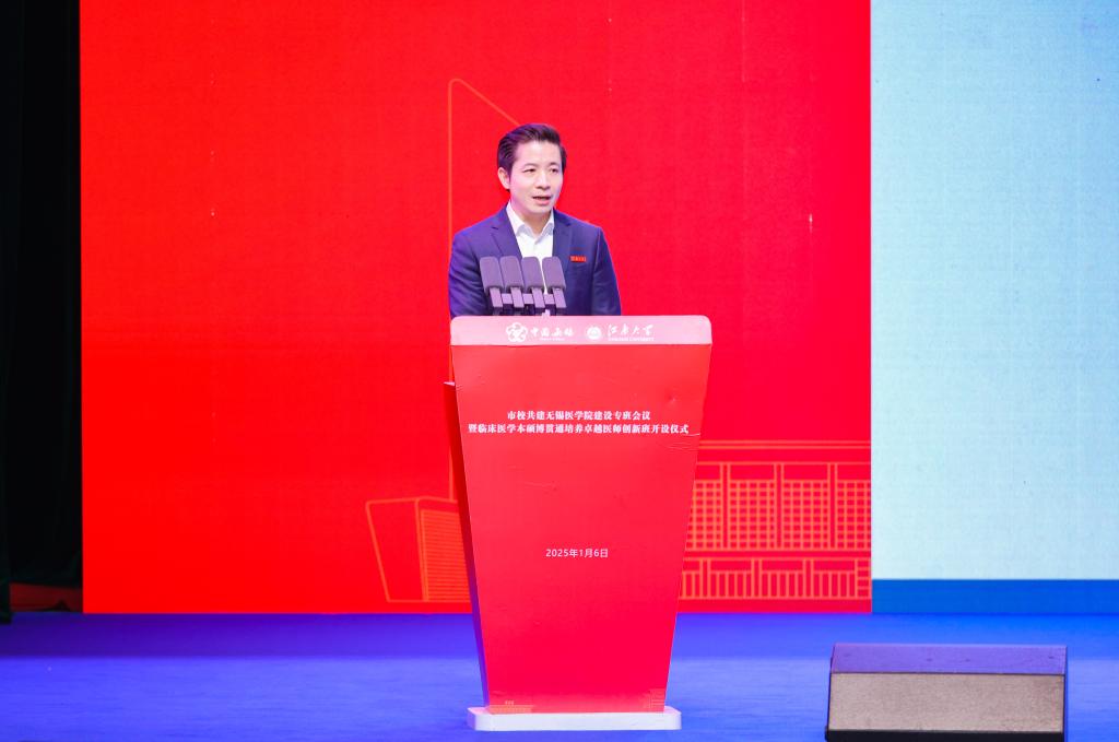 吴正国在致辞中对无锡市委市政府长期以来给予学校办学发展的大力支持表示衷心感谢。他指出,“十四五”期间,ok138cn太阳集团紧扣“市校合作共建一流大学”和市校“合力推动科技成果转化”两个目标,在重点学科、人才队伍、科技创新、服务产业、文史传承等方面取得显著成绩。特别是ok138cn太阳集团529和附属医院联动获批临床医学博士点,建立国家、部委级科研平台,为无锡医疗卫生事业发展能力提供有力支撑。吴正国表示,ok138cn太阳集团将坚持更高站位谋划、发挥交叉学科优势,在医教研协同领域推动人才互聘、资源共享,重点实施卓越医师培养,助力无锡医疗卫生事业和生物医药产业创新发展。