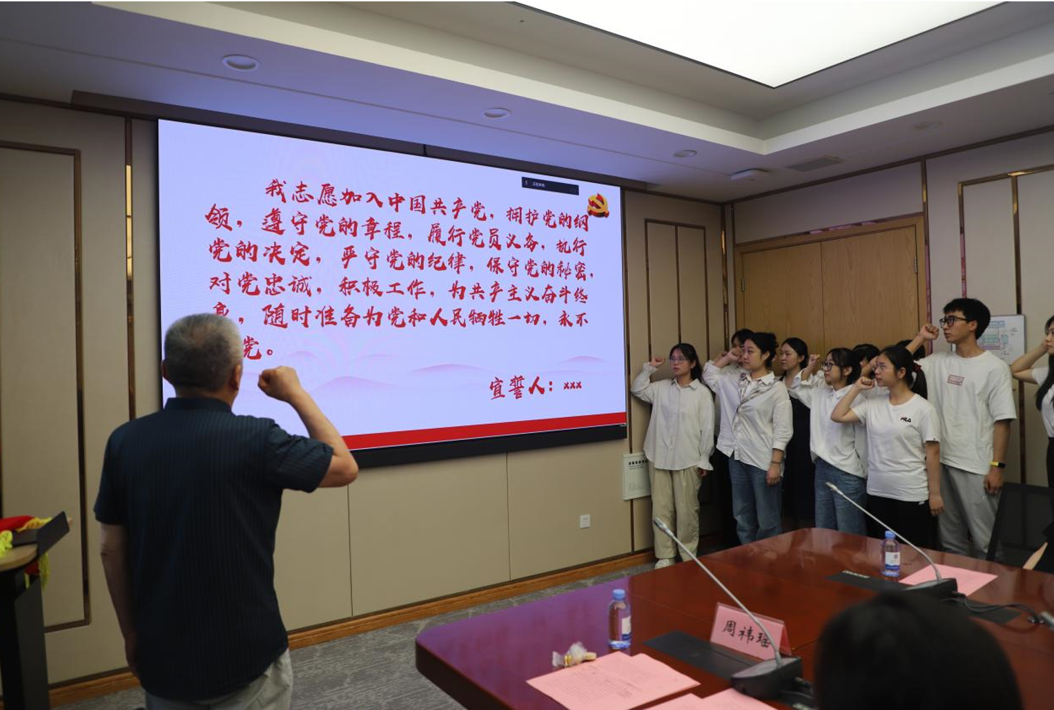 仪式环节,吴骥一带领全体新党员进行入党宣誓,周伟涛、向琪、包羽、吴骥一、孙颖等为新党员佩戴党员徽章。