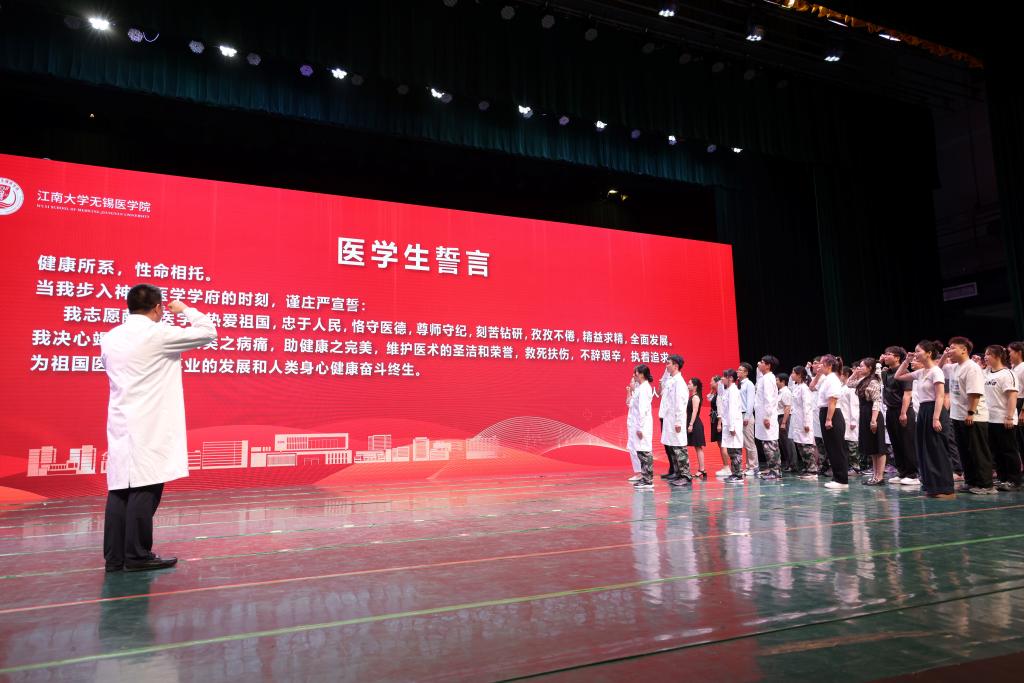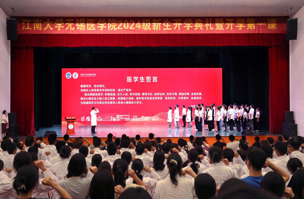 2024级新生代表临床医学专业(5+3)本科生李科锋、硕士生靳光浩、博士生龚娟从自身成长经历出发,共同讲述寻来时根、圆江南梦、问未来路的医学之旅,强烈表达了“江南医学人”牢记医学使命,践行医学誓言的责任感、认同感和归属感,并代表全体新生表态:未来将长志气、增骨气、厚底气,以厚德博学立身、以勤学明道立世、以精诚济世立业。