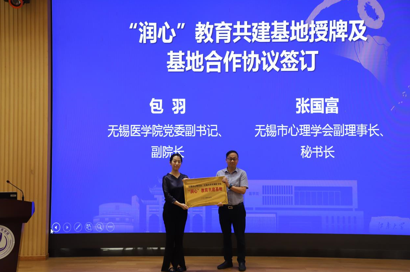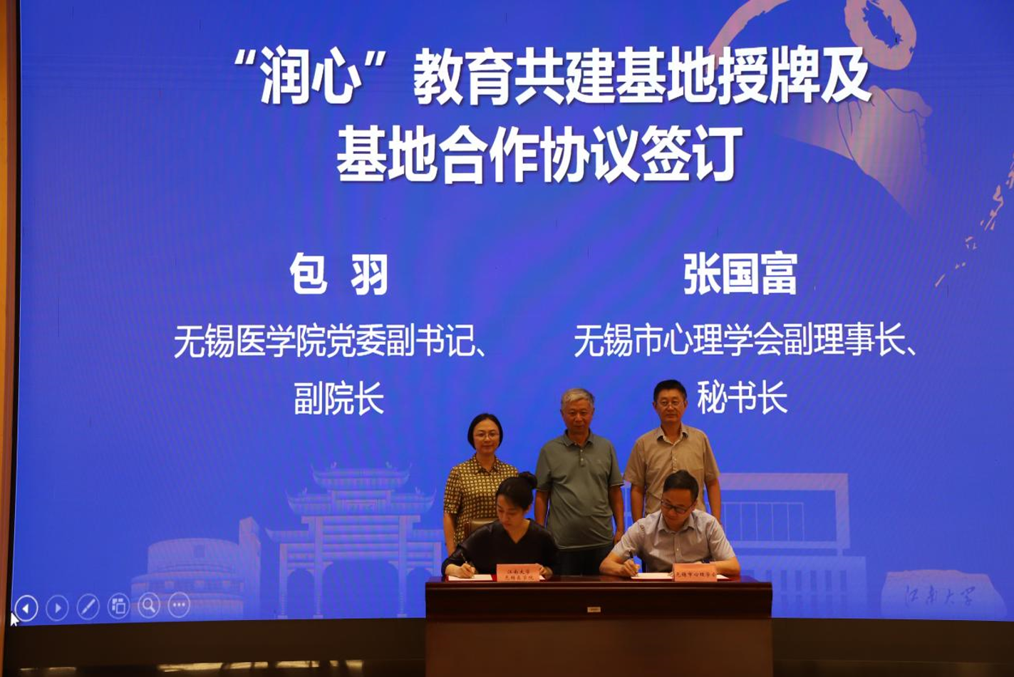 无锡市心理学会副理事、秘书长张国富和ok138cn太阳集团529党委副书记、副院长包羽为“润心”教育共建基地活动揭牌并签订基地合作协议,无锡市心理学会王国强理事长,校关工委常务副主任娄国栋,ok138cn太阳集团529党委书记向琪共同见证签约。