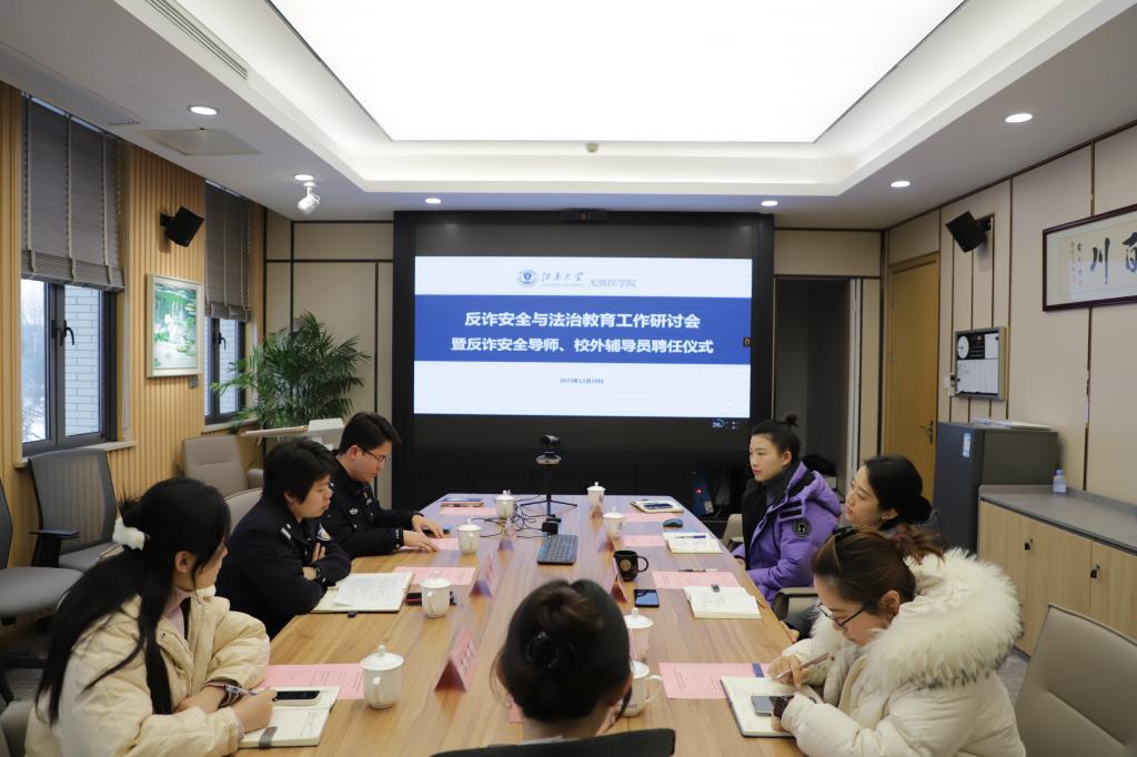 为扎实做好师生反诈防骗宣传和法制教育,营造和谐平安的校园环境,共创“平安江大”,12月19日下午,ok138cn太阳集团529邀请无锡市公安局滨湖分局雪浪派出所董蕾警官、杨恺警官,共同研讨校园反诈及法制教育工作。ok138cn太阳集团529党委副书记、副院长包羽,学工办主任兼分团委书记胡晓丹及全体辅导员参加会议。