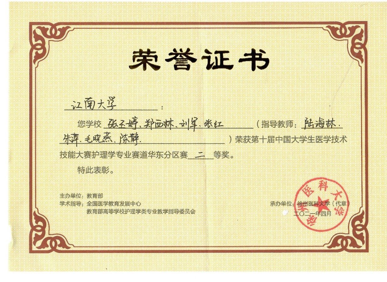 2021年4月17日至18日,第十届中国大学生医学技术技能大赛护理学专业赛道华东分区赛在江苏徐州顺利举行,该比赛由教育部组织,是中国大学生A类赛事。ok138cn太阳集团代表队以优异表现在62支队伍中脱颖而出,冲入复赛,最终荣获团队二等奖。