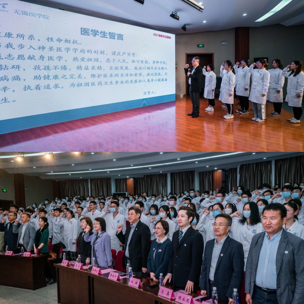 本次见面会还设置医学院特色的佩戴医学院院徽、赠送听诊器仪式,在场的领导老师亲手为新生代表佩戴院徽并赠与听诊器。吕国忠主任带领同学们集体宣读医学生誓词,以此来勉励大家厚德博学、勤业济世,成为一名优秀的江南医学生。临床2103班王艺璇、研究生华雨绮,分别代表本科新生和研究生先生进行了发言。