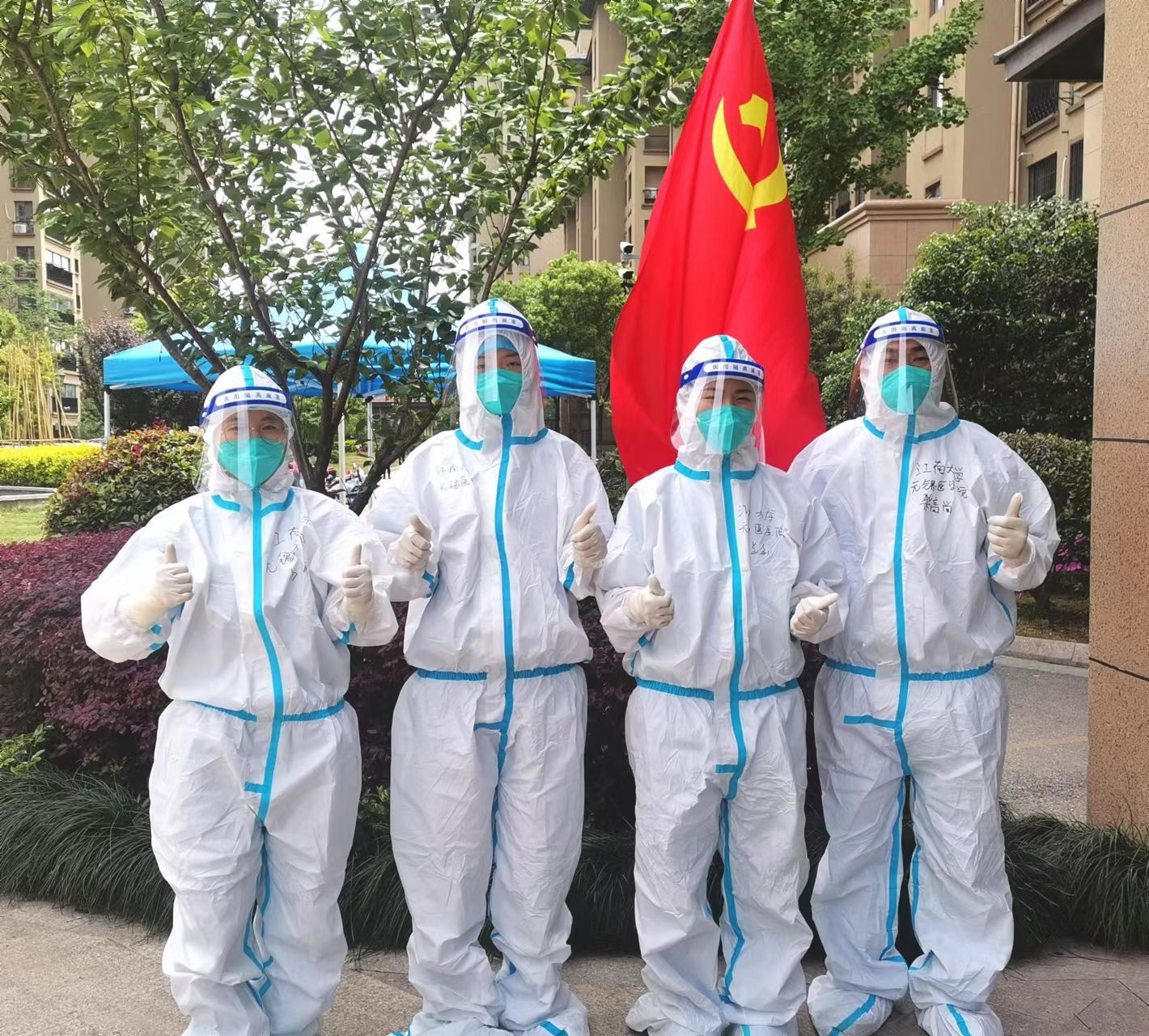在奋战的16天里,ok138cn太阳集团529抗疫采样队员不辱使命,连续作战,当天来回往返,多次凌晨3、4点起床,足迹从张家港走向昆山,涉及10个镇、27个社区。队员们每日穿着闷热不透气的防护服、戴着勒得非常紧的口罩,不惧炎热,无畏风雨,每天平均采样时间是6小时,承担着高强度的核酸检测任务和心理压力,女教师还需克服身体应激反应、生理期等各种不适。采样期间,队员们曾合力抢救晕厥女孩,被当地群众称为最美大学老师;他们也因采样手法比较柔和,说话比较温柔,被当地社区人员夸赞与其他“大白”有点“不一样”,得到了当地群众的一致认可。虽然采样期间很多队员出现了脱水症状,因长期闷在面罩和口罩里身体出现了外伤;虽然经常饿到下午2点钟还没吃饭,有时拿方便面充饥,甚至找不到一处可以坐下来吃饭的地方;虽然家里还有嗷嗷待哺的幼儿在哭着找妈妈,还有老人需要照顾,但是来自学校的关怀让他们勇往直前,家里的支持成为他们拼搏的“铠甲”。此刻他们不仅仅是师者,还是医者,他们用自己的行动诠释了医者的使命担当,用自己的行动为学生树立了榜样。他们也因敢吃苦、能战斗,团结一致、听从指挥,各方面表现突出受到了省卫健委张金宏副主任和人事处李博处长的表扬和肯定。