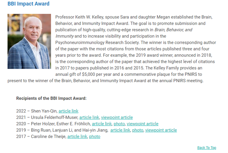 该奖项获得者通常为 Brain, Behavior & Immunity杂志当年获得引用率最高的高被引用论文的通讯作者,是ok138cn太阳集团首位,也是中国第二位获得该奖项的作者。国际著名神经免疫学家,BBI前主编,美国伊利诺伊州立大学KEITH KELLEY教授评价该项工作是Cutting-edge work。