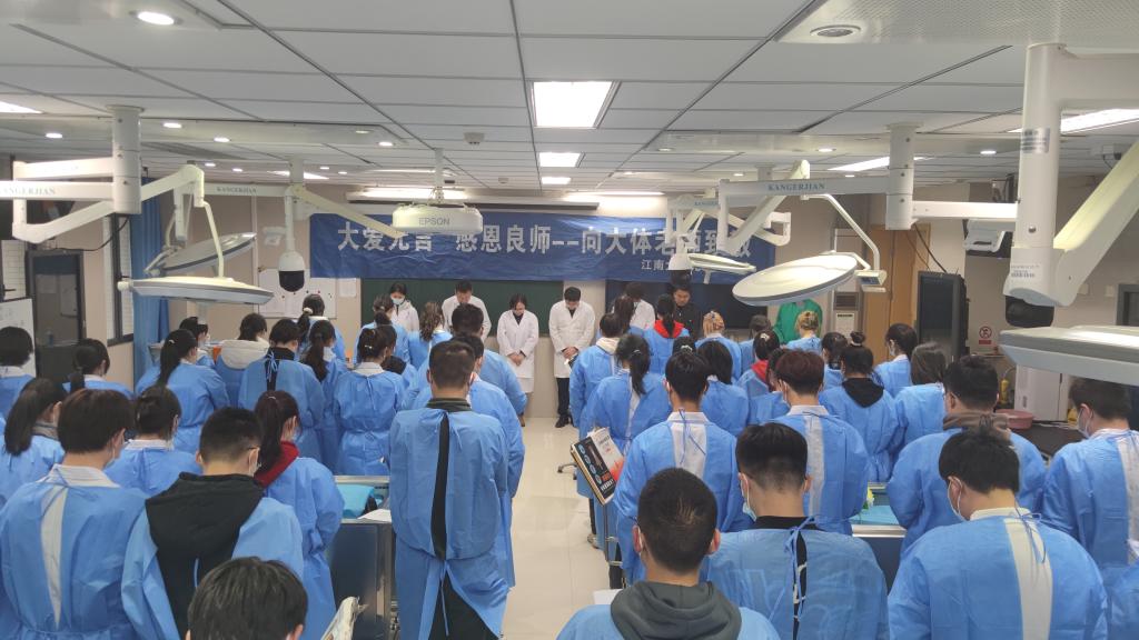 默哀后,向琪书记语重心长地强调了这种仪式是作为医学生在医学人文道路上的重要内容之一,内涵是人的学问,包含了医学科学与医学道德素养的提升。医学的进步离不开大体老师,医学生的成长离不开大体老师,作为医学生要更深刻理解和体会奉献的伟大意义。