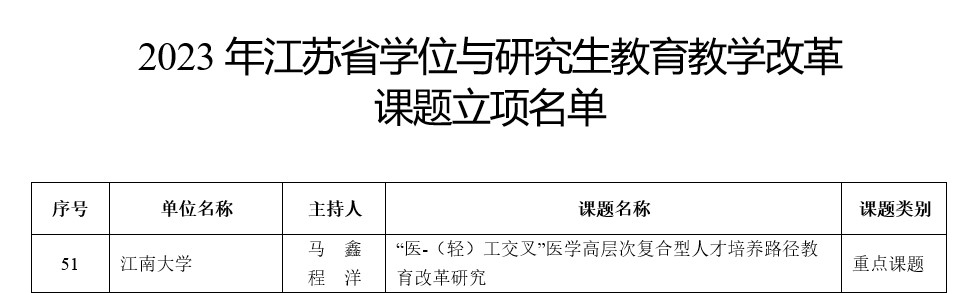 近日,江苏省教育厅公布了2023年江苏省学位与研究生教育教学改革课题立项名单,经学校推荐、专家遴选、省教育厅公示和审定,我院马鑫、程洋领衔申报的《“医-(轻)工交叉”医学高层次复合型人才培养路径教育改革研究》喜获重点课题立项,实现了我院在该项目类别上的突破。
