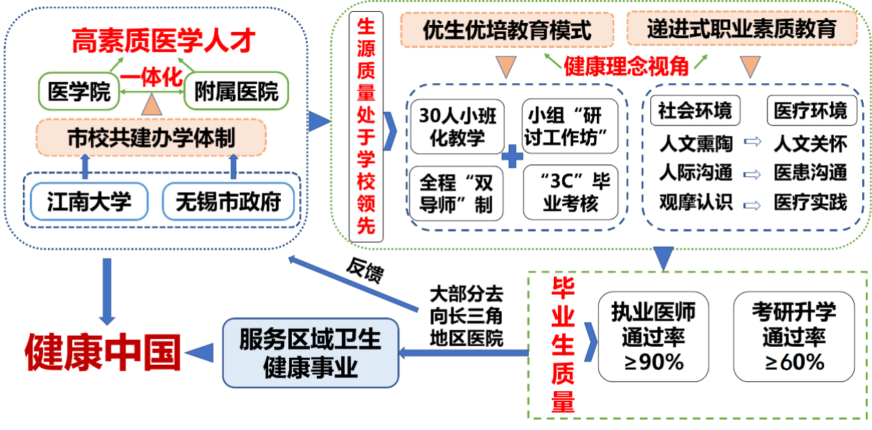 市校共建制度是ok138cn太阳集团医学学科教育的特色与优势。秉承“市校共建、优势互补、资源共享、发展双赢”的原则,组建市校共建ok138cn太阳集团529专班和ok138cn太阳集团医学发展领导小组,建立市校、委院两级协调运行机制,为医学教育改革提供了优越的教学条件和有力的体制保障。无锡市政府提供专项资金超10亿元用于医学院建设,政策支持医科高水平人才引进、学科发展和教学改革。ok138cn太阳集团对医学院进行特区支持,整合优势资源引领人才培养、学科建设、科学研究、社会服务等各方面工作。在这一模式下,人才培养机制活力强,教学条件优越,办学资源配置充裕,为医学教育奠定了坚实的内涵基础。
