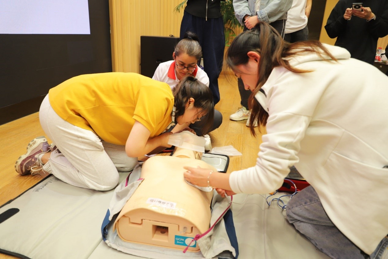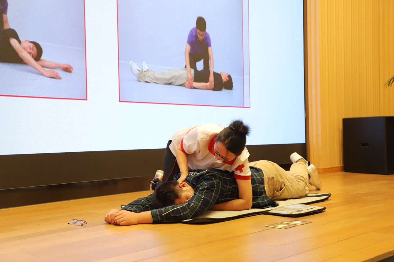 活动进入第二部分,红十字会急救指导老师展示并讲解了心肺复苏术(CPR)+自动体外除颤器(AED)的操作流程,强调AED使用的注意事项及其重要性,AED的普及和使用可以最大限度提高心源性猝死患者的急救成功率,唐老师还重点说明了救治“黄金四分钟”。