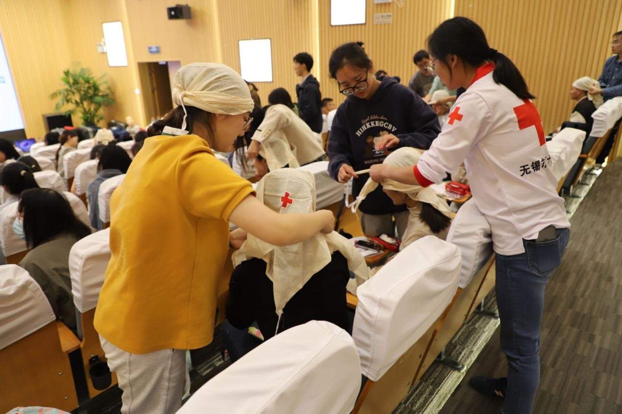 首先,唐镇棣老师开场介绍了红十字会的发展历程和工作内容,紧接着主要介绍了创伤救护、止血包扎、心肺复苏以及AED体外除颤仪使用等急救步骤和注意事项,并对心肺复苏术、海姆立克法以及常见创伤包扎等应急救护技能进行了重点示范。
