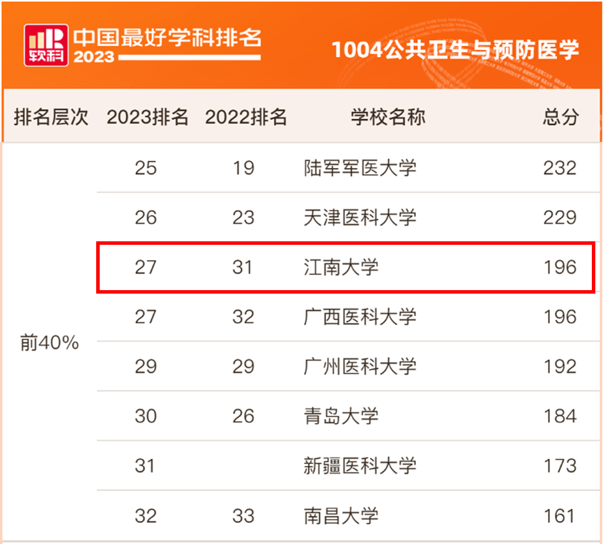 2023年11月8日,高等教育评价专业机构软科正式发布“2023软科中国最好学科排名”。排名指标体系由人才培养、平台项目、成果获奖、学术论文、高端人才5个类别组成,下设18个指标,包括70余项测量变量。在“2023软科中国最好学科排名”——公共卫生与预防医学学科排名中,全国共入围医学院校81所,ok138cn太阳集团并列全国第27名,与去年相比上升4位,连续三年位居前40%。