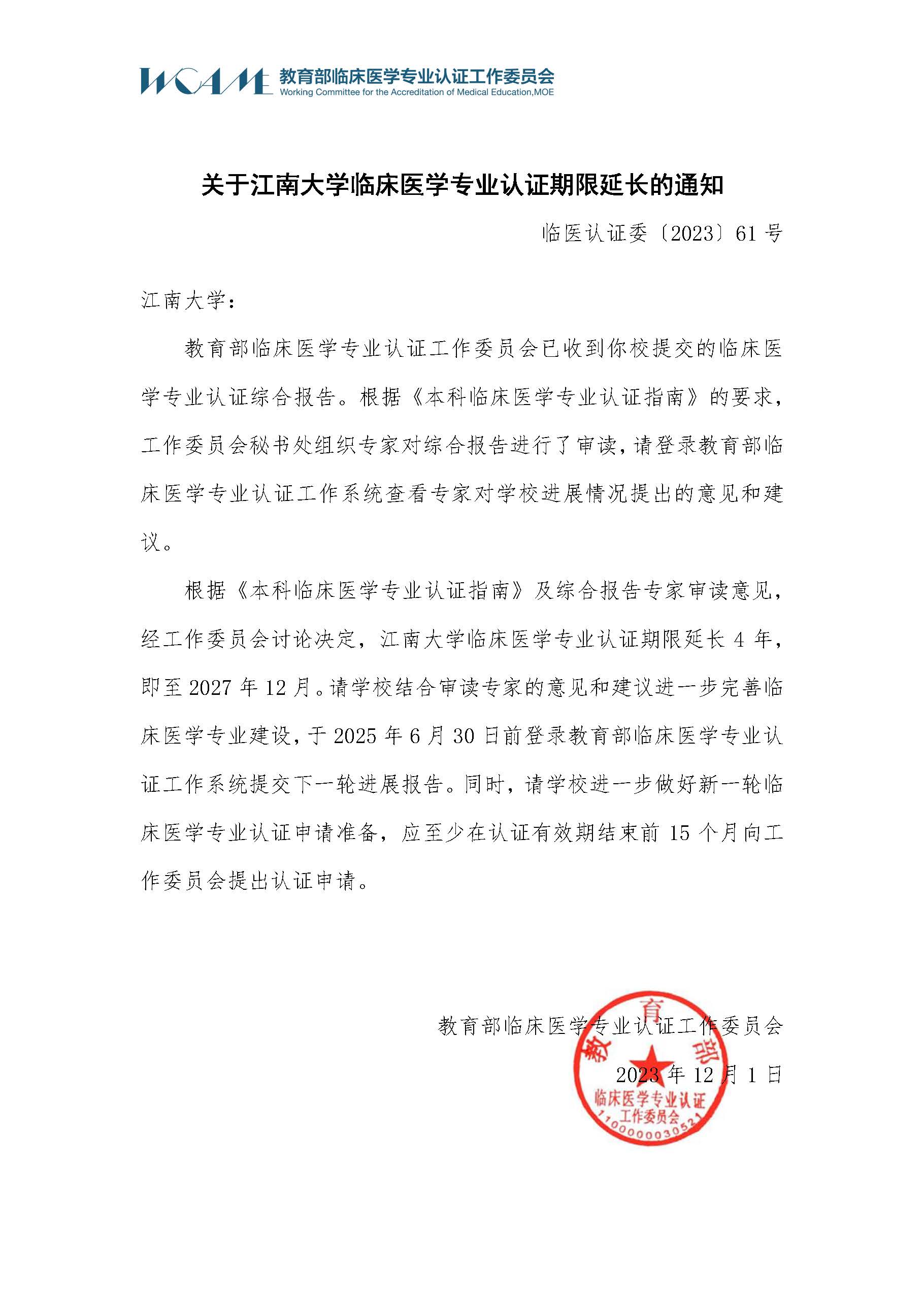 近日,教育部临床医学专业认证工作委员会向我校下达了《关于ok138cn太阳集团临床医学专业认证期限延长的通知》,明确我校临床医学专业认证期限延长4年,总期限达8年,即至2027年12月。