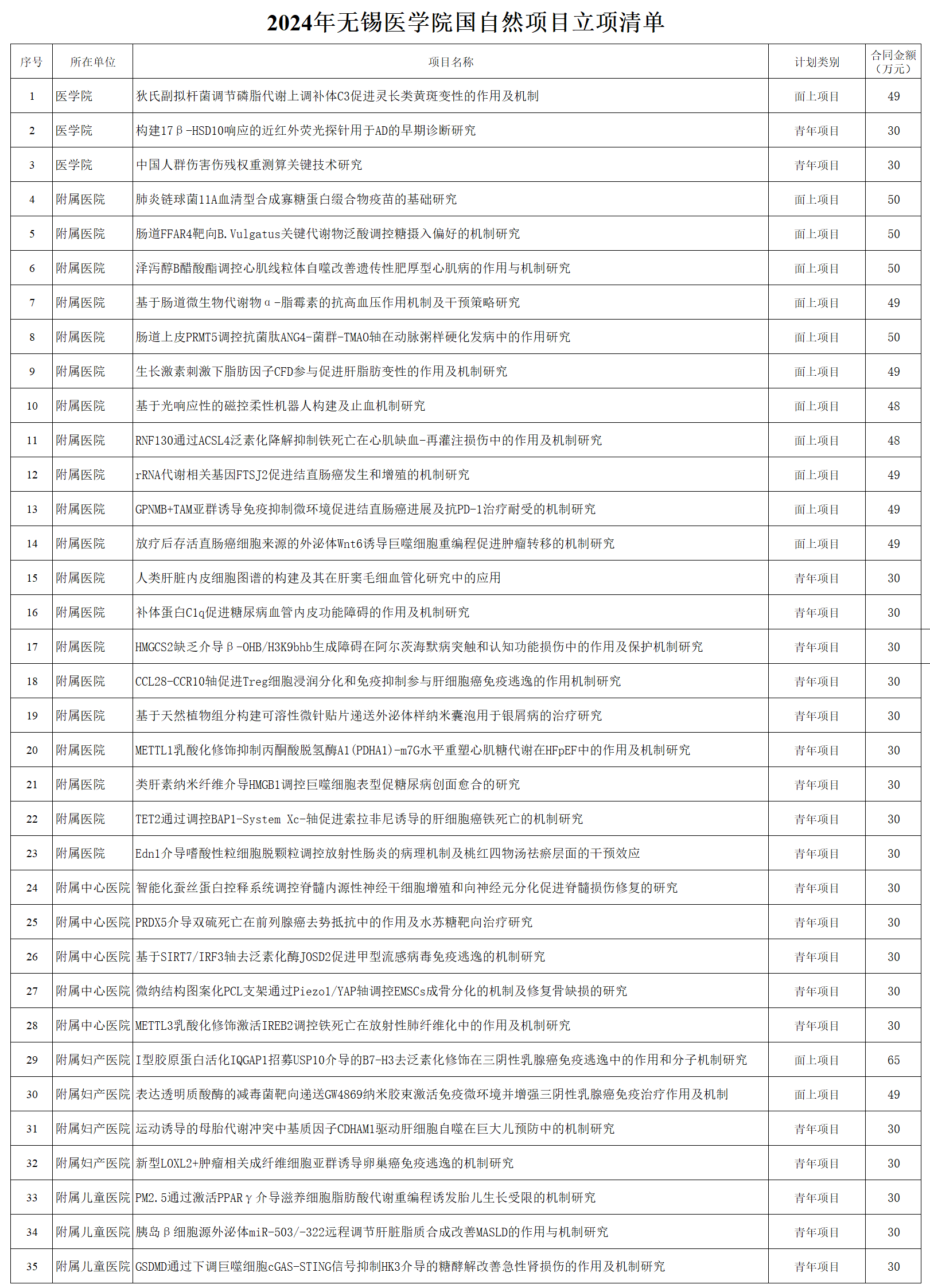 近日,国家自然科学基金委员会公布了2024年度自然科学基金项目评审结果,ok138cn太阳集团529协同附属医院在本年度国家自然科学基金项目申报工作中再创佳绩!2024年共有35项项目获立项资助,获批项目数、批准项目经费,再创历史新高,其中,面上项目14项,青年基金项目21项,获得直接经费1334万元,为医学院完成十四五科研项目目标打下坚实基础!