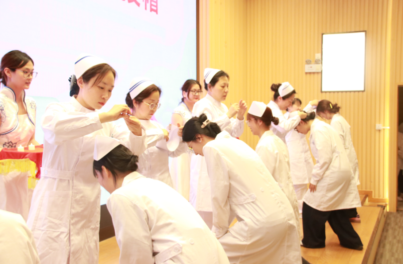 护理系蒋玉宇主任、邱玉宇、柳丰萍、林毅老师以及来自附属中心医院的俞萍主任和卞红老师作为授帽嘉宾为2023级护理专业同学授帽。同学们戴上庄严洁白的燕尾帽,接过前辈手中的蜡烛,温暖的光芒映照着每一张年轻而坚定的脸庞。这一刻,他们用手托举起护理工作者的光荣使命,将南丁格尔精神牢记于心。在附属中心医院护理部副主任俞萍的带领下,2023级护理专业全体同学庄严宣誓,全心全意服务人民、鞠躬尽瘁奉献事业的诺言掷地有声。