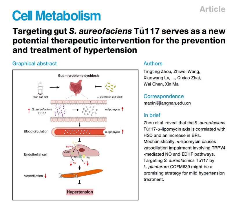 近期,在创新中心的支持下研究成果突出,创新中心马鑫教授团队在《Cell Metabolism》期刊上发表了题为“Targeting gut S. aureofaciens Tü117 serves as a new potential therapeutic intervention for the prevention and treatment of hypertension”的研究性论文,该研究揭示了金色链霉菌α脂霉素轴导致高血压,补充植物乳酸菌可显著改善临床高血压症状,该研究为改善高血压症状提供了新思路;创新中心孙宁教授团队在《Nature Aging》期刊上发表了题为“Gut microbial-derived phenylacetylglutamine accelerates host cellular senescence”的研究性论文,该研究揭示了肠道菌群来源代谢物苯乙酰谷氨酰胺加速宿主细胞衰老,阻断肾上腺素能受体以及衰老细胞裂解疗法在延缓苯乙酰谷氨酰胺诱导的宿主细胞衰老上的可行性,该研究为对抗衰老提供了新的思路和解决策略;创新中心朱升龙副教授/陈永泉教授团队在《Nature Microbiology》期刊上发表了题为“Free fatty acid receptor4 modulates dietary sugar preference via the gut microbiota”的研究性论文,该研究揭示了游离脂肪酸受体4(Ffar4)通过肠道微生物群调节膳食糖偏好,Ffar4组织特异性激动剂的开发可能是糖尿病预防的另一种方法;创新中心申延琴教授团队在《Brain Behavior and Immunity》期刊上发表了题为“Gut microbiota promote the propagation of pathologicα-syn from gut to brain in gut-originated Parkinson's disease model of mice”的研究性论文,该研究揭示了肠道菌群在肠起源帕金森病中的动态变化规律,首次证实肠道菌群(尤其是Dubosiella)是推动α-syn病理从肠到脑传播的关键因素。除此之外,创新中心庞庆丰教授、吴郁教授等团队发表高质量研究成果近10篇,授权发明专利多项。