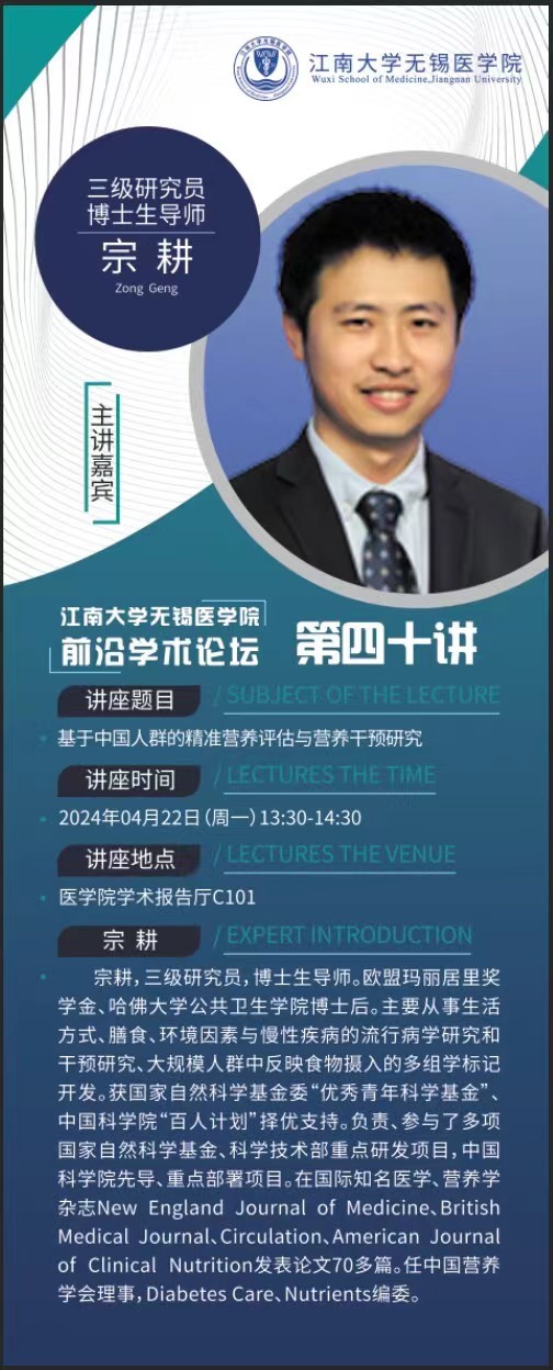4月22日ok138cn太阳集团529前沿学术论坛第四十讲 宗耕研究员——基于中国人群的精准营养评估与营养干预研究