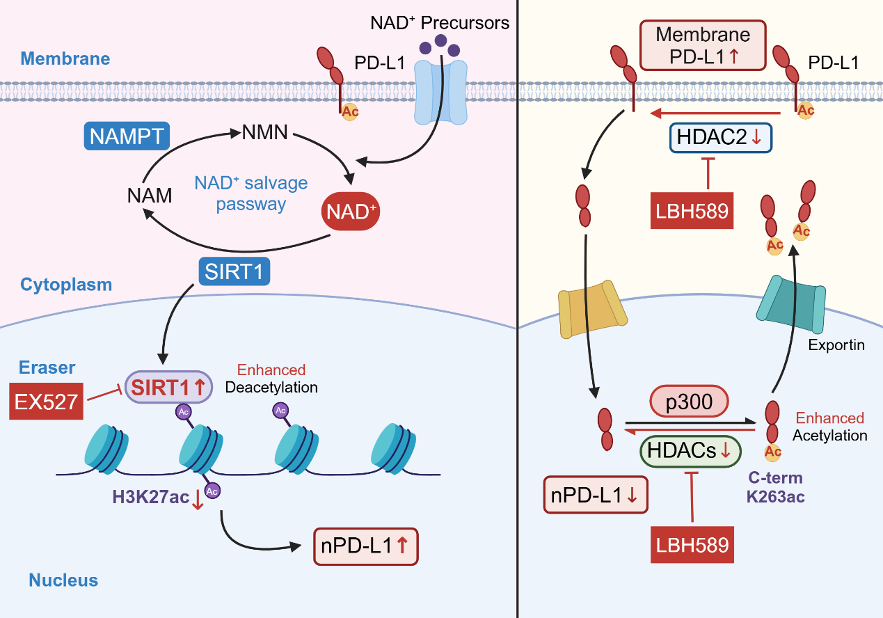 该研究从临床现象入手,发现晚期宫颈癌患者存在PD-L1核定位升高这一关键特征。通过体外实验深入探究其背后的分子机制,表明NAD+代谢可通过NAMPT/SIRT1通路,降低组蛋白H3K27位点的乙酰化水平,进而诱导PD-L1核定位升高,致使肿瘤细胞发生免疫逃逸。