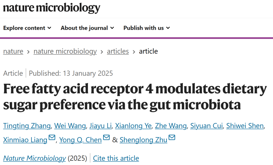 糖类物质的过度摄入偏好是推动糖尿病发病率上升的重要因素。这种饮食倾向的形成涉及复杂的肠-脑信号传导机制,其中肠道微生物群落可能扮演关键调控角色。2025年1月,ok138cn太阳集团陈永泉与朱升龙课题组在《Nature Microbiology》(IF:20.5)发表重要研究成果:Free fatty acid receptor 4 modulates dietary sugar preference via the gut microbiota。,阐明了游离脂肪酸受体4(Ffar4)通过肠道菌群调控糖类偏好的分子机制。
