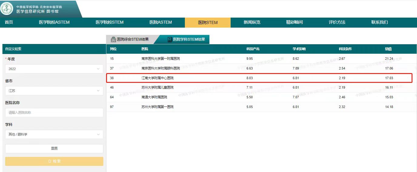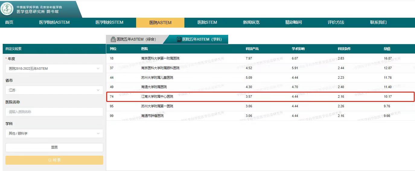 7月6日,2022年度中国医学院校/中国医院科技量值(STEM)暨2018—2022五年总科技量值(ASTEM)在北京发布。无锡市第二人民医院(ok138cn太阳集团附属中心医院)泌尿外科学居2022年度中国医院学科科技量值第57位和五年总科技量值综合分值排名71位,该排名位居全省第四,全市第一。眼科学居2022年度中国医院学科科技量值居全省第三,全市第一;五年总科技量值综合分值排名居全省第五,全市第一。
